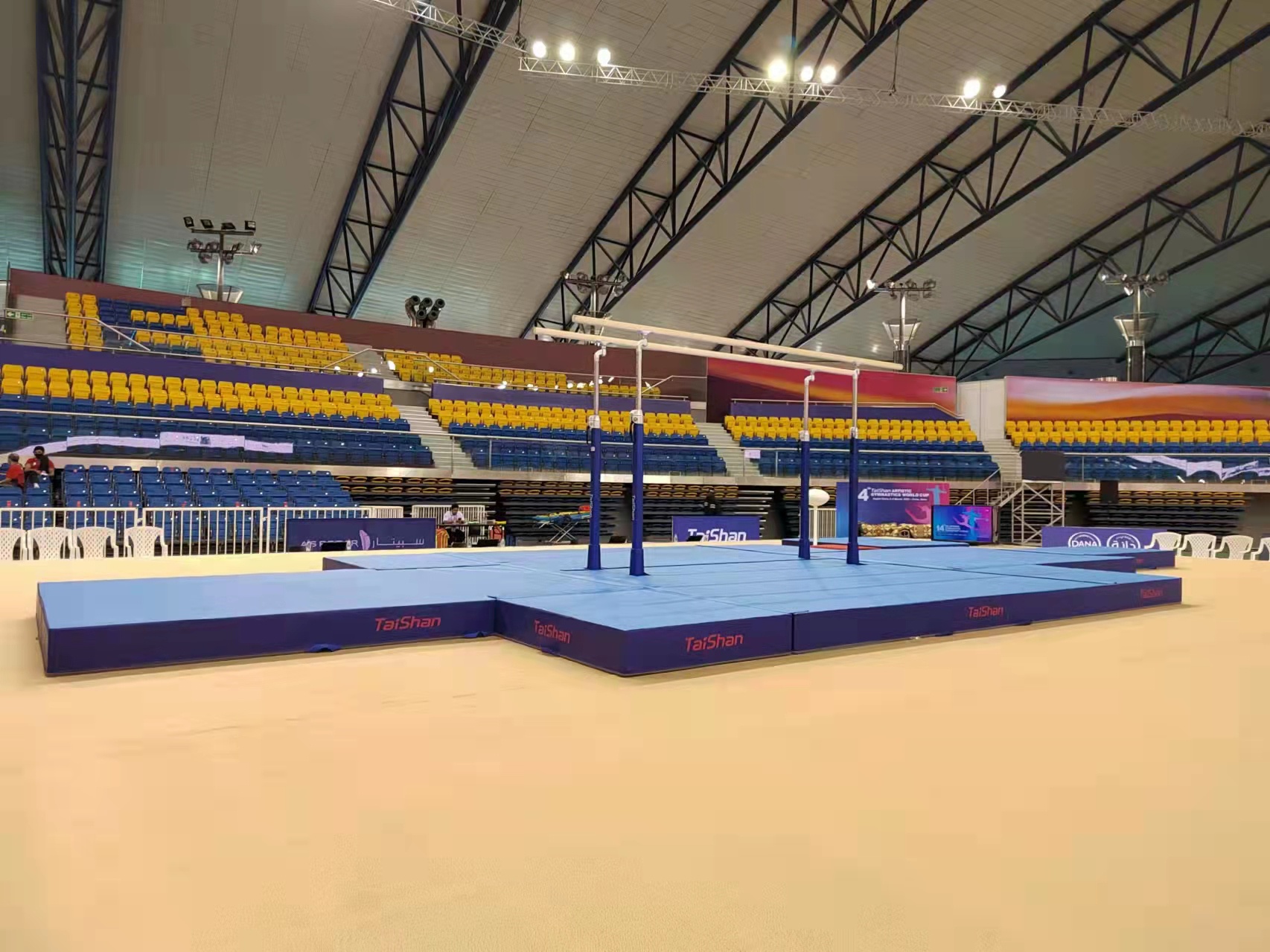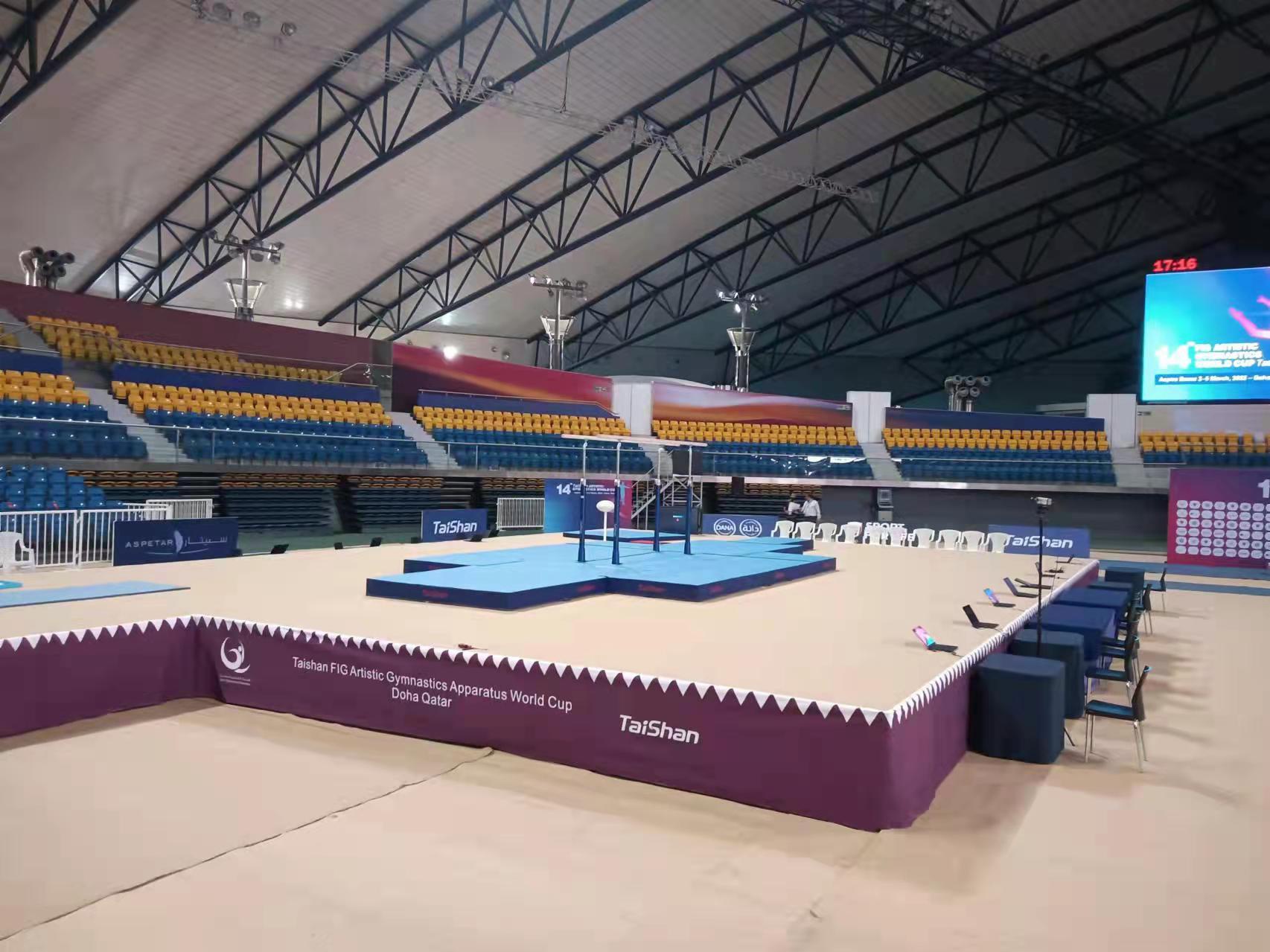为保障运动健儿的出色发挥,bb贝博Ballbet派出了经验丰富的专业服务团队,于2月22日出发,到达多哈后,队员们不辞辛劳,马上投入到技术指导和安装工作中,并按计划于2月28日圆满完成男子训练馆、女子训练馆、竞赛馆等场馆的安装、调试工作。