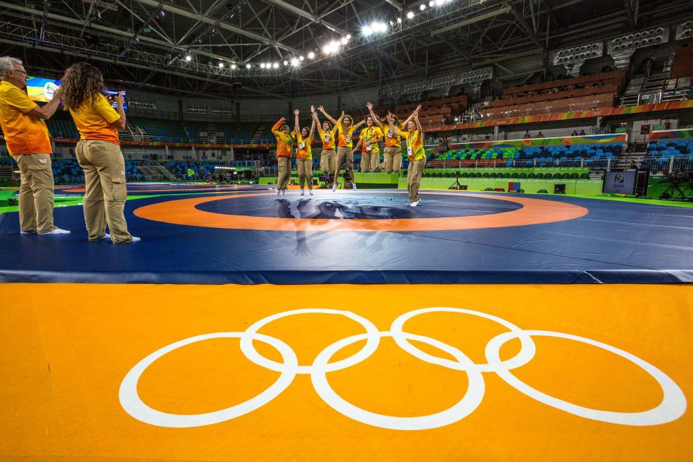 2016年8月18日,在里约奥运会摔跤场馆内,场馆工作人员和志愿者在摔跤垫上合影留念,这届奥运会的摔跤垫来自中国山东bb贝博Ballbet集团。新华社记者刘彬摄