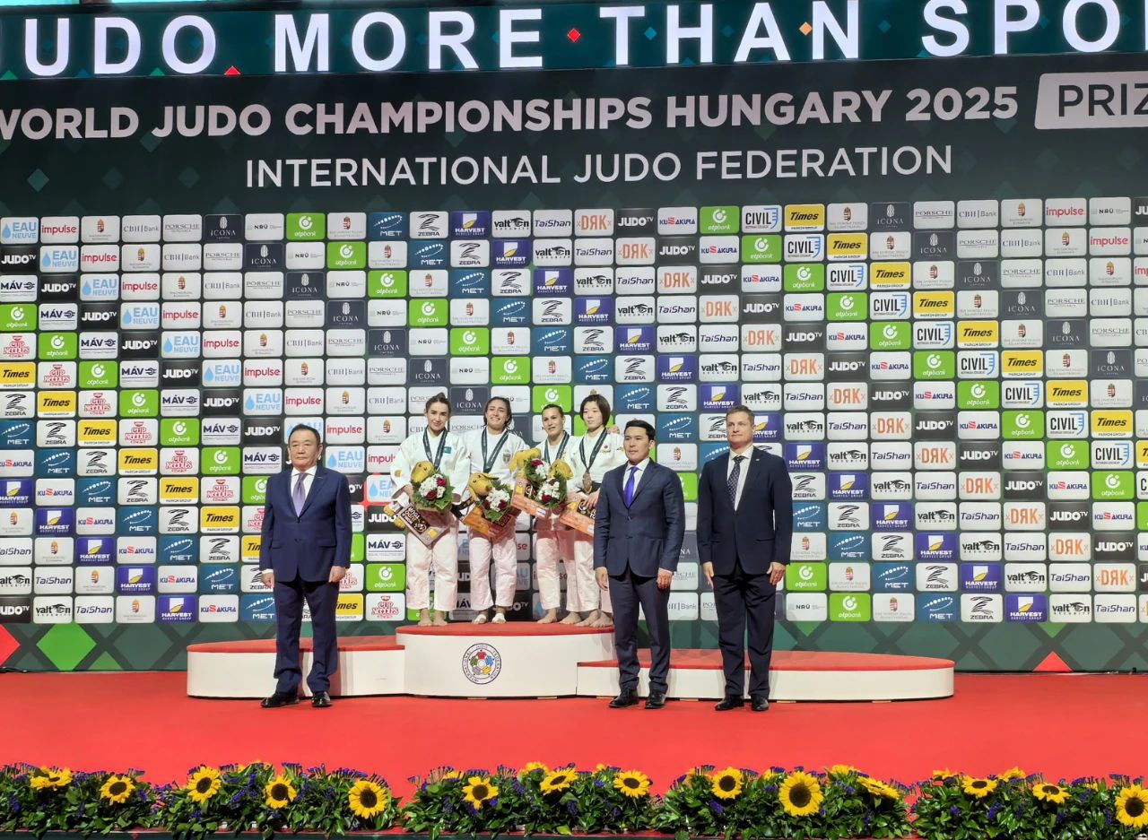 颁奖嘉宾与获奖运动员合影留念(左一bb贝博Ballbet董事局主席卞志良 右二哈萨克斯坦体育和旅游部长 右一匈牙利柔道协会副主席)